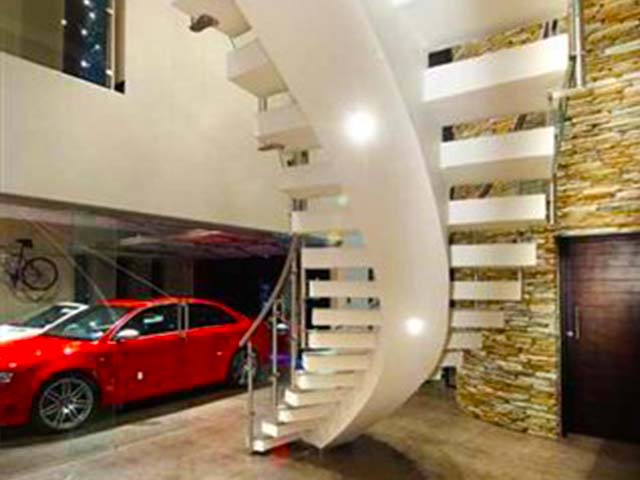 This curved variation of the cantilever stairs still has the illusion of a floating staircase but in a style more fitting to it’s environment.